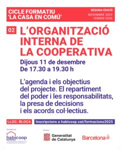 La Casa en Comú és un cicle subvencionat per l’Ajuntament de Barcelona format per quatre sessions de dues hores on es tractaran diversos temes relacionats amb l’habitatge cooperatiu: